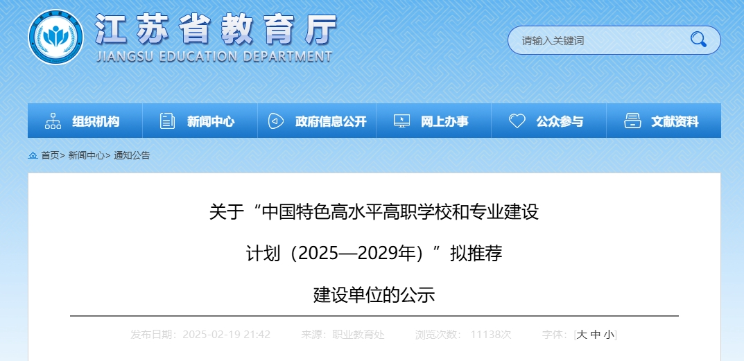 2月19日,江苏省教育厅发布《关于“中国特色高水平高职学校和专业建设计划(2025—2029年)”拟推荐建设单位的公示》,其中拟推荐建设单位有20所,备选单位有2所,共计22所。