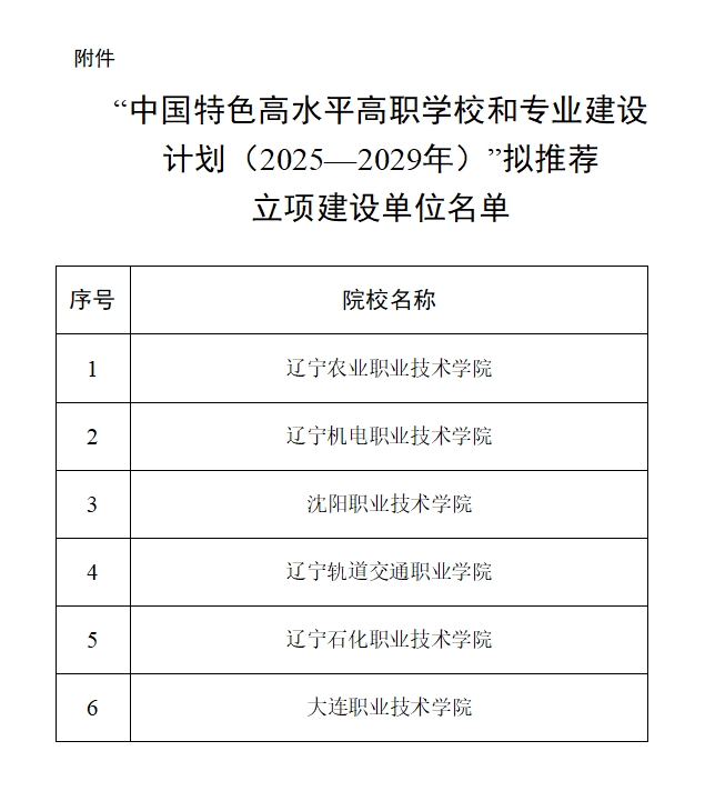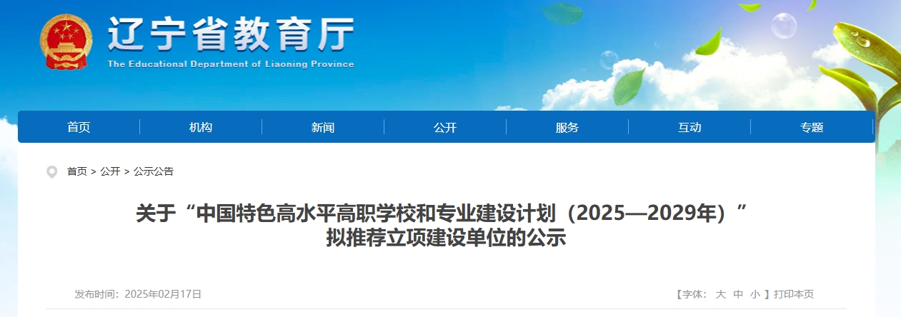 2月17日,辽宁省教育厅发布《关于“中国特色高水平高职学校和专业建设计划(2025—2029年)”拟推荐立项建设单位的公示》,根据《教育部 财政部关于实施中国特色高水平高职学校和专业建设计划(2025—2029年)的通知》(教职成〔2025〕1号)要求,在院校申报、条件初审、材料评审、现场答辩、专家评议等程序后,现对“中国特色高水平高职学校和专业建设计划(2025—2029年)”拟推荐立项建设单位予以公示,名单见附件。