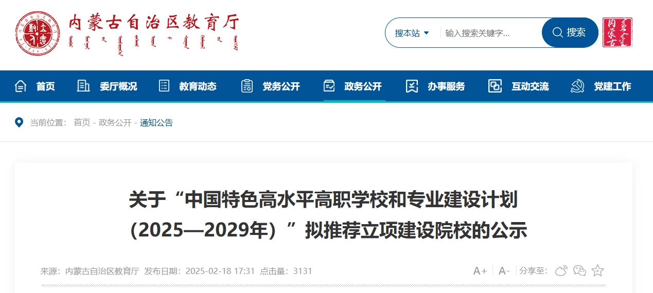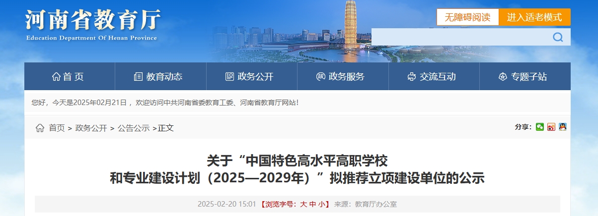 关于“中国特色高水平高职学校和专业建设计划(2025—2029年)”拟推荐立项建设院校的公示
