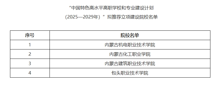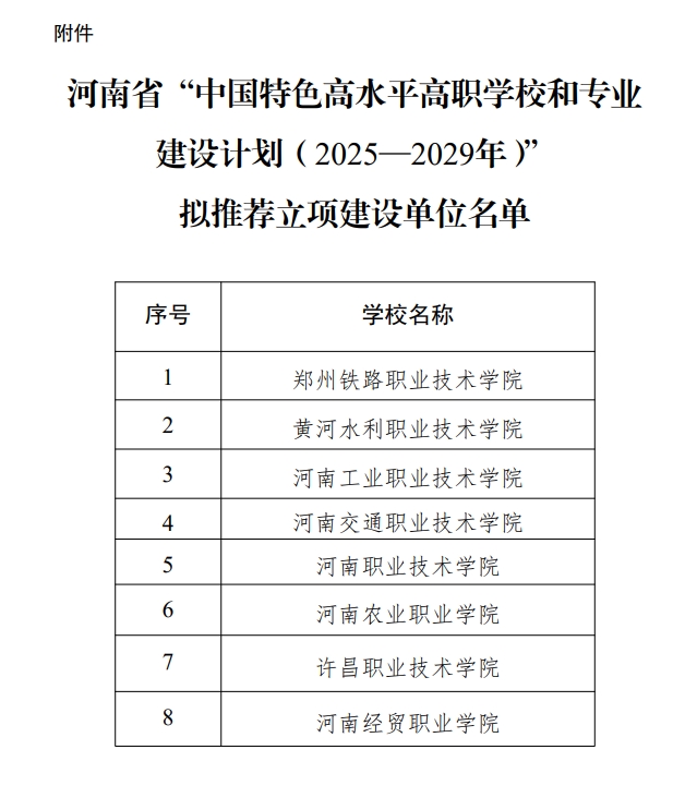 根据《教育部 财政部关于实施中国特色高水平高职学校和专业建设计划(2025—2029年)的通知》(教职成〔2025〕1号)要求,经院校申报、材料评审、现场汇报和答辩、专家评议等程序,现对“中国特色高水平高职学校和专业建设计划(2025—2029年)” 拟推荐立项建设院校予以公示,名单见附件。
