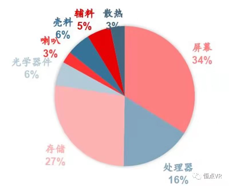 VR终端的硬件部分主要由处理器、存储、屏幕、光学器件、声学器件、壳料、辅料构成。由于目前VR产品的使用场景主要是游戏和视频,以图像处理和显示为功能重点,因此在硬件成本中,负责计算、渲染和图像处理的CPU和GPU占比较高,占比16%左右;另外VR也需要较高的内存,存储成本占比27%;包括屏幕和光学器件在内的显示器件占比约为40%。