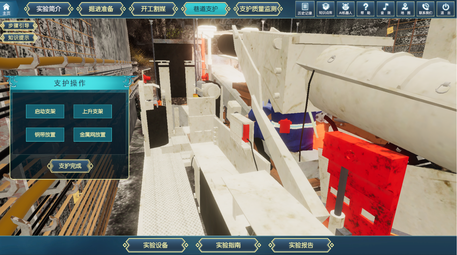 同时,《智能掘进工作面虚拟仿真实验》还能帮助学生掌握智能掘进工作面的巷道支护方式,包括临时支护和永久支护的基本概念、特点、适用条件及流程,深入理解支护技术。熟悉支护质量检测,强调设备检测和矿压监测的重要性及操作流程,了解应力分布、矿压显现特征及监测方法。掌握智能化开采关键技术,培养学生运用专业知识和工具分析解决矿山生产技术问题的能力,提升资料搜集、归纳总结及撰写研究报告的能力。