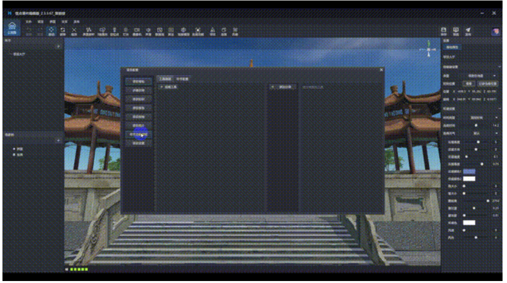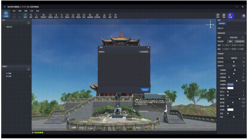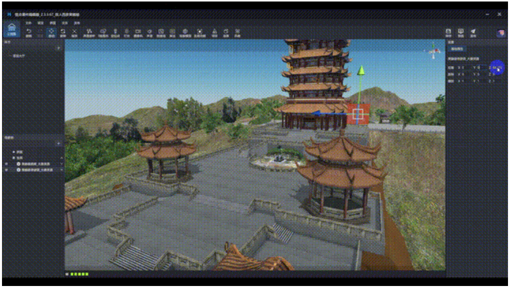 从资源库中找到“黄鹤楼”场景资源,拖拽到操作区域生成景区基础场景,调整视角作为最佳游览观赏视角。