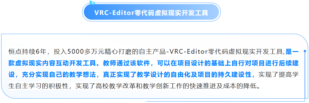 恒点公司结合当前问题,自主研发零编程、配置化、模块化的虚仿项目开发工具,他的优势和特点很好的解决了上述问题,加快推动了虚拟仿真项目建设的脚步。