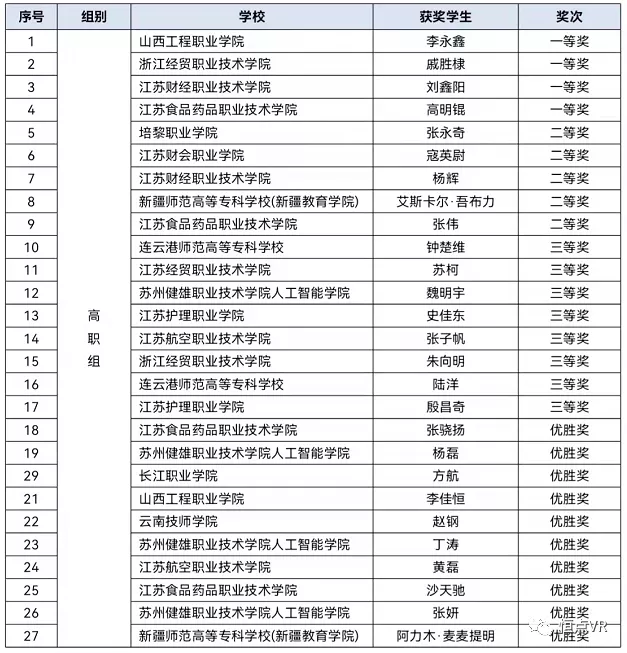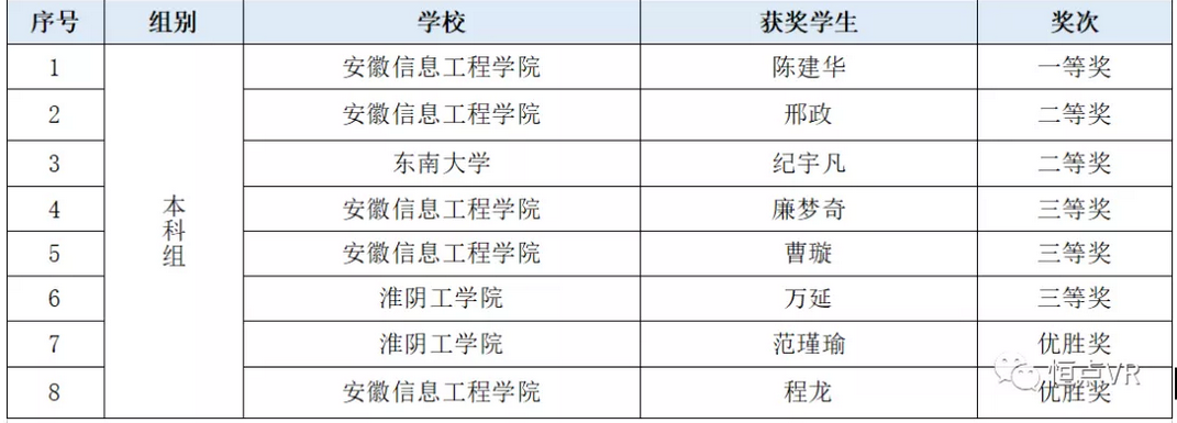 根据《关于举办 2021年“恒点杯”虚拟现实设计技能竞赛的通知》,全国高等院校计算机基础教育研究会专家团队,通过对参赛的8个本科组和31个高职组作品进行评审,共评选出本科组一等奖 1名,二等奖 2名,三等奖 3名,优胜奖 2名;高职组一等奖4名,二等奖 5名,三等奖 8名,优胜奖 10名。