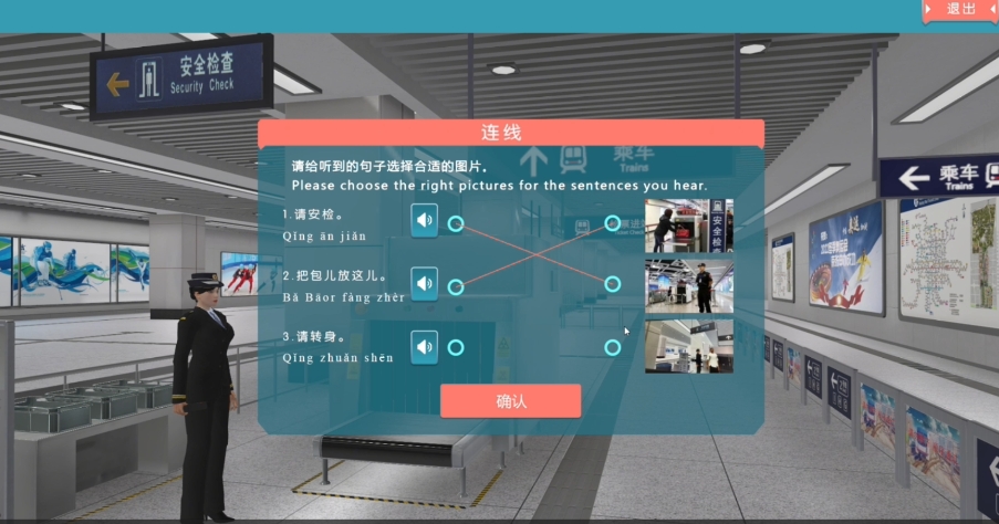 实验分为地铁购票情景语言教学和地铁乘车站点语言教学虚拟仿真实验两部分,具有高度的互动性和智能化评估系统。根据不同的虚拟情景和教学需求,恒点配合北京语言大学开发出智能虚拟角色系统。针对地铁售票员、安检人员、乘车人员等角色的岗位职责及规范操作流程进行训练,实时指引外籍人士地铁出行,学生可以在模拟的地铁场景中进行汉语词义学习、语义判断和汉语言跟读学习,全面提升跨文化交际能力。