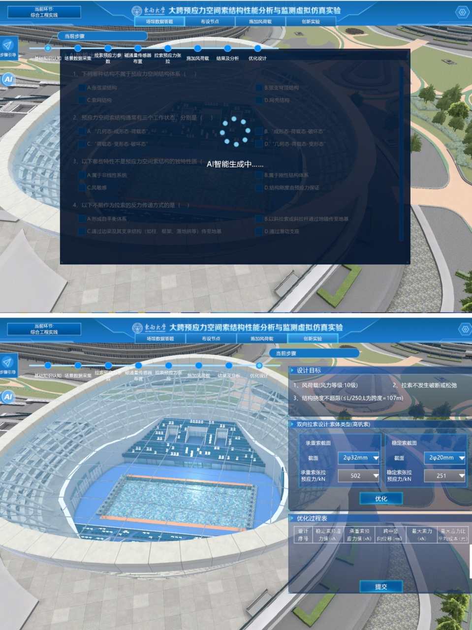 例如,在恒点为东南大学开发的《大跨预应力空间索结构性能分析与监测虚拟仿真实验》中,如果学生在某个环节中频繁出错,AI 系统能够迅速识别出该知识点为其薄弱环节,并立即从学习图谱中为其推送相关的知识点讲解、案例分析以及针对性的强化练习,帮助学生及时弥补知识漏洞。