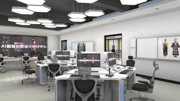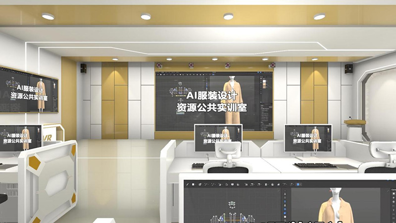 AI服装设计公共资源实训室构建了以3D设计、产品仿真、虚拟测款的全链路数字化的能力培养体系,实训室采用了AI智能工具库、XR 交互-服装展示资源开发编辑器、数智化服装虚拟仿真实训教学管理平台等工具,满足学生进行线上协同审款改款。