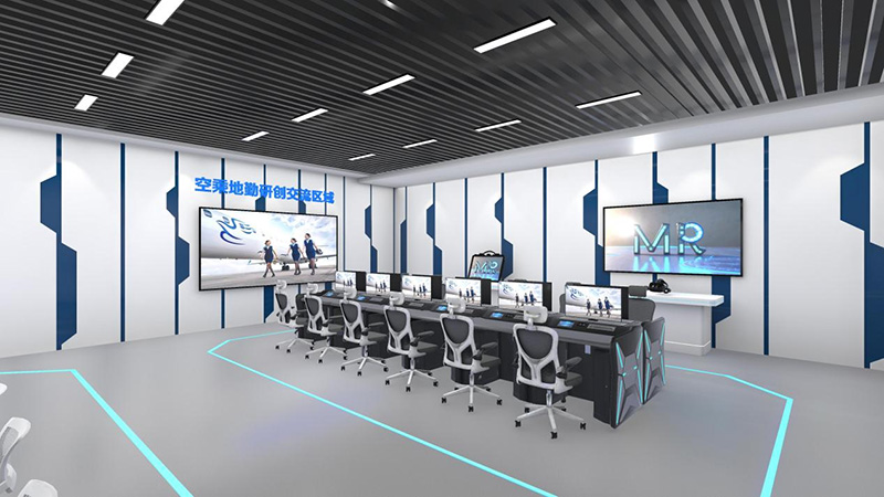 虚拟仿真研创中心包含MR大空间空乘地勤操作区域、空乘地勤研创交流区域、研创教学成果展示区,可实现有限的空间无线的课堂、创新创业孵化和创办职业技能竞赛等活动。