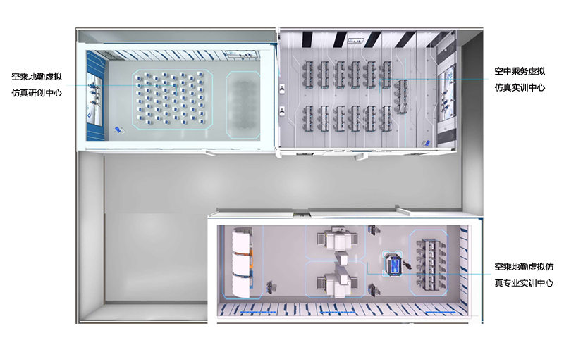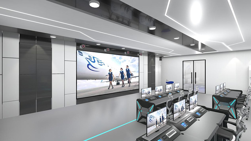 空中乘务虚拟仿真实训中心包含XR-3DLed大屏互动区域、空乘地勤虚拟仿真实训示教区、XR虚拟现实训练区、空乘地勤实训工作站四个区域,配有空乘地勤实训工作站配套实训软件。