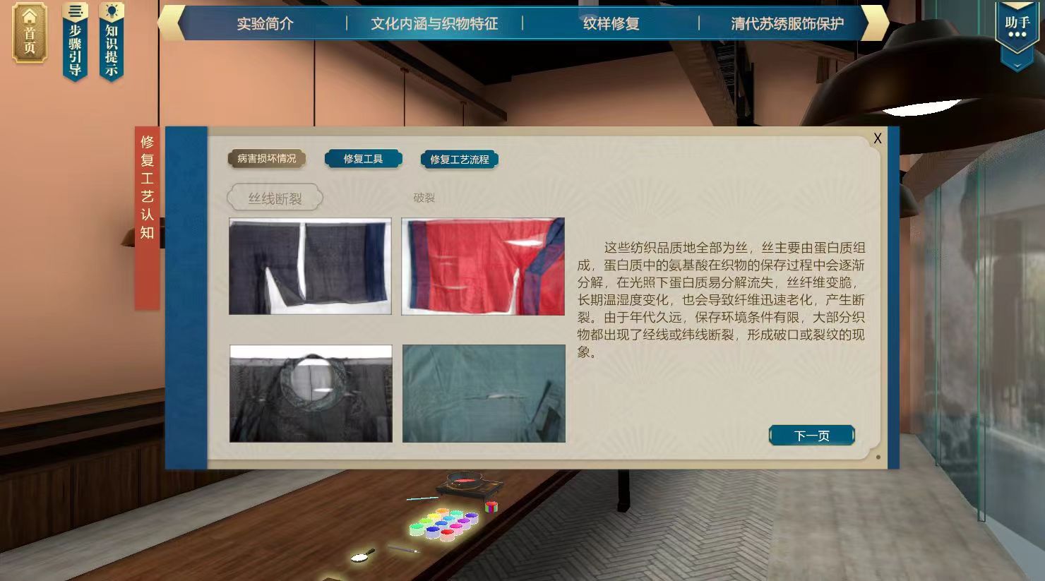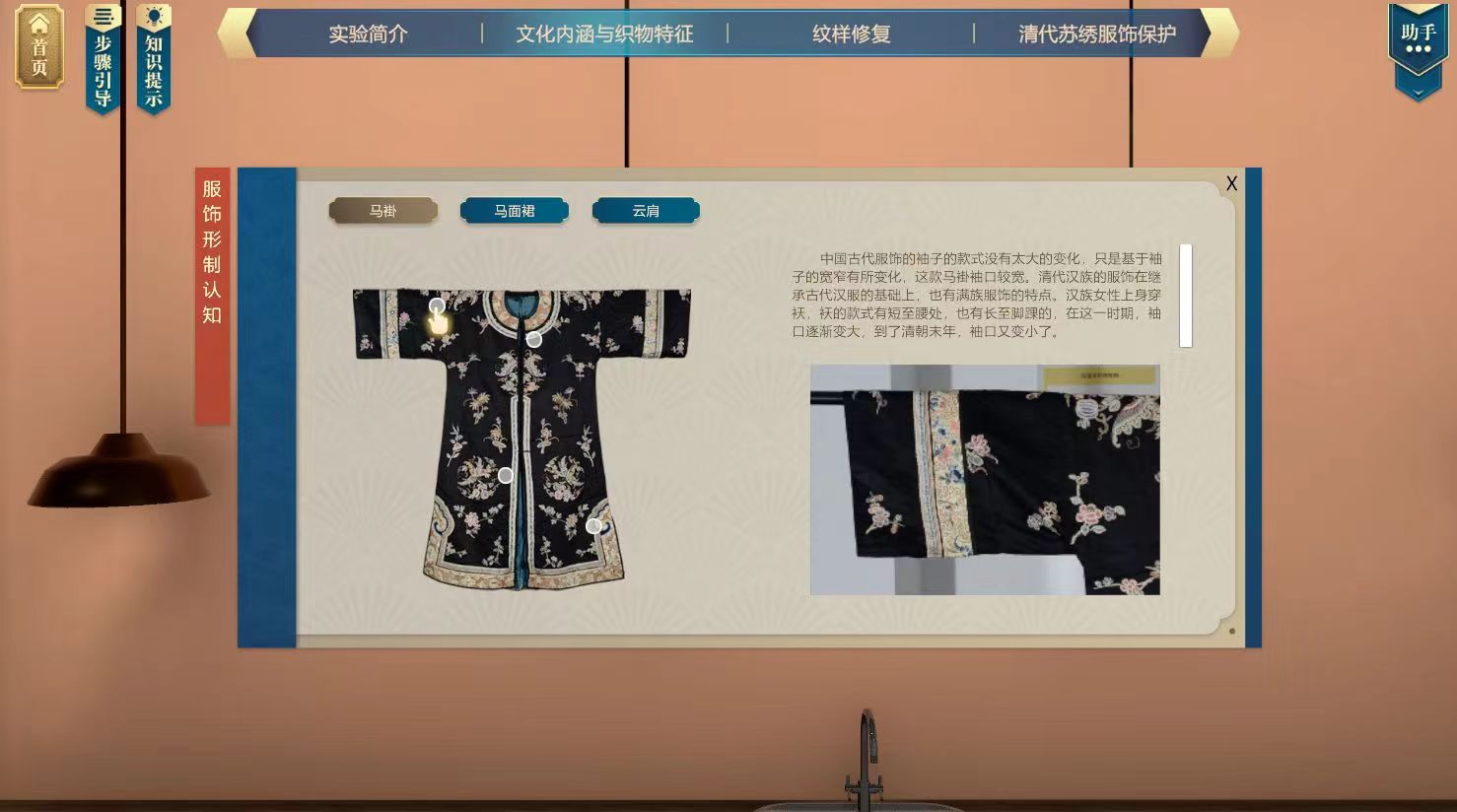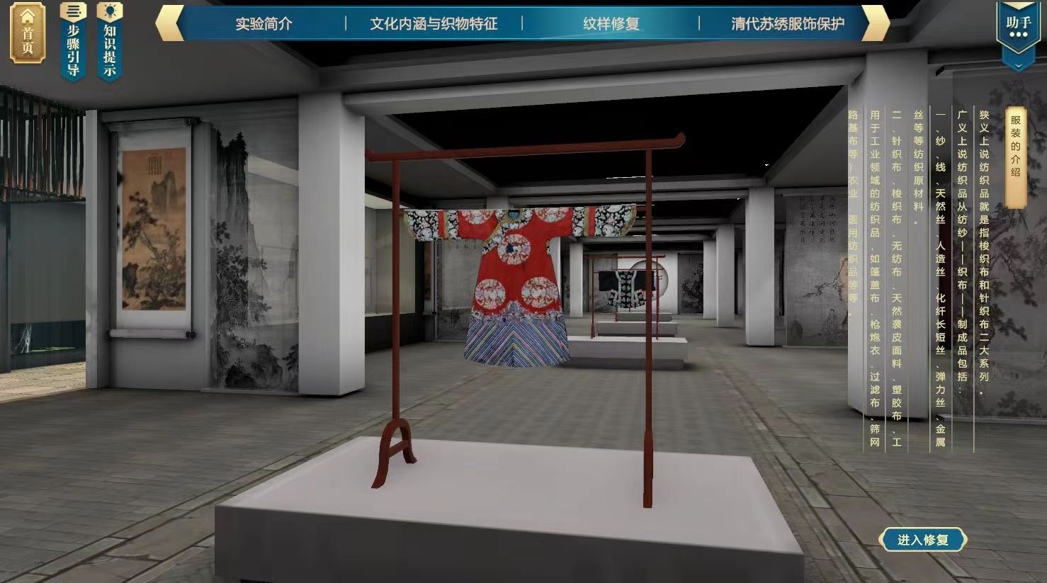 本实验以考古资料及其相关复原实物为佐证、以博物馆馆藏苏绣服饰与当代苏绣服饰设计为内容主体,建立了清代苏绣服饰虚拟三维数据库系统,数字化还原了清代服饰平面结构与缘饰艺术,并实现了网络共享。在具有沉浸感的历中氛围中,将抽象的理论知识直观化,学生从实验提供的清代苏绣服饰数学资料库提取设计素材,根据实验中具体要求,进行清代苏绣服饰结构与解构的综合性虚拟仿真设计实验。