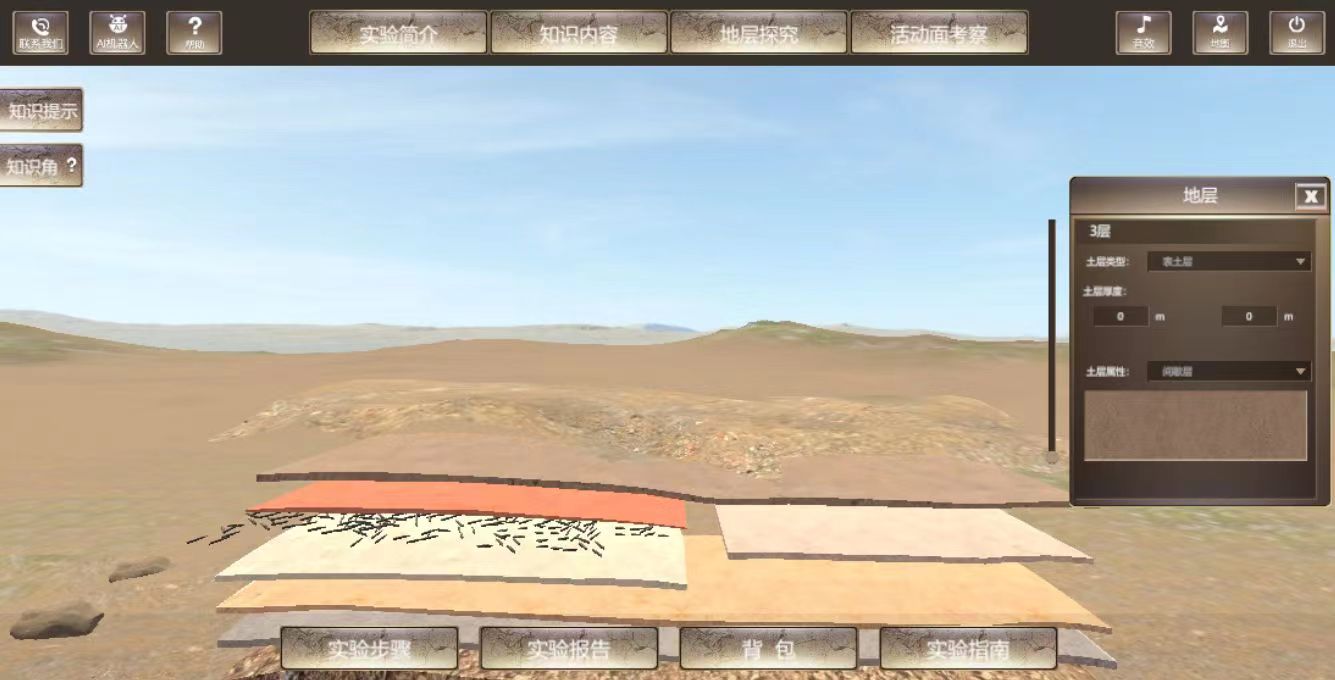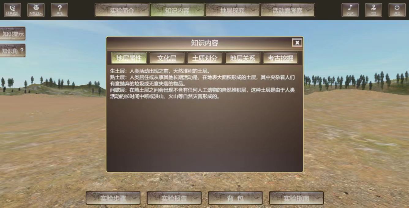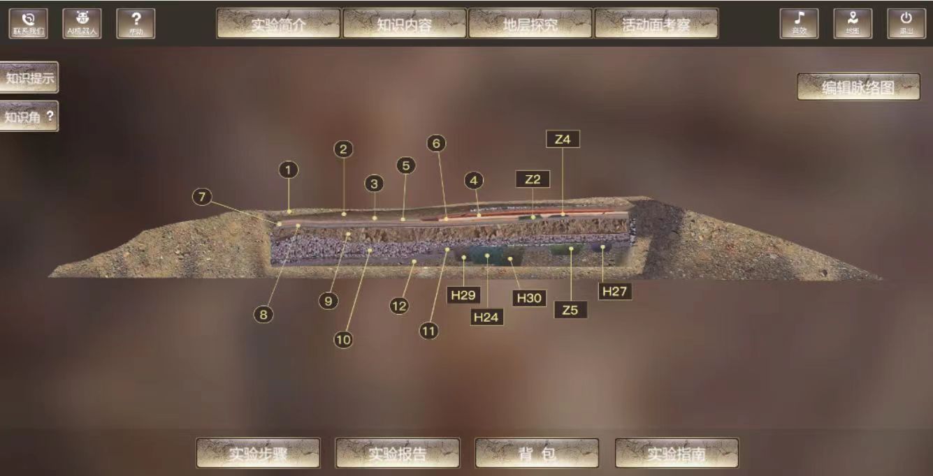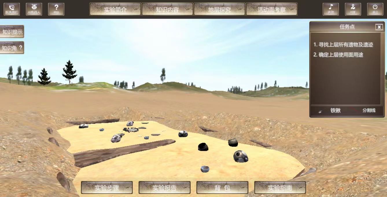 基于三维建模技术和 B/S 和 C/S 架构的虚拟互动田野考古实践教学系统,主要为考古专业学生教学专门设计开发。通过对考古遗址进行原真性复原,在虚拟仿真情境下培养、训练学生观察、分析、判断各类考古遗迹的特征;学习考古发掘的基本流程;模拟操作进而掌握考古工作中的基本技能。
