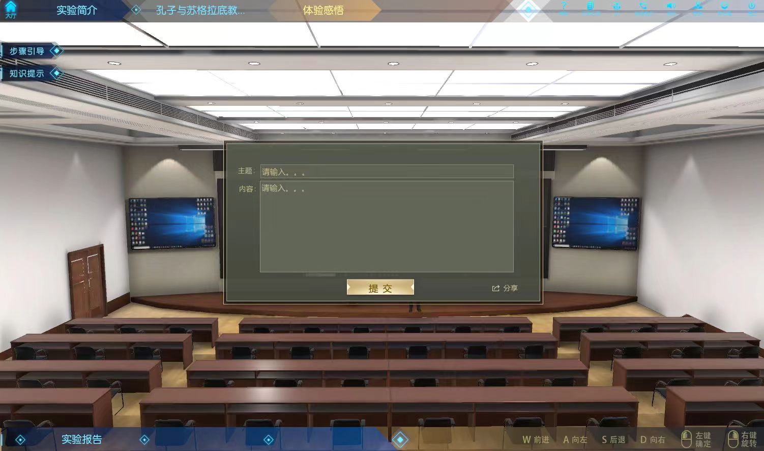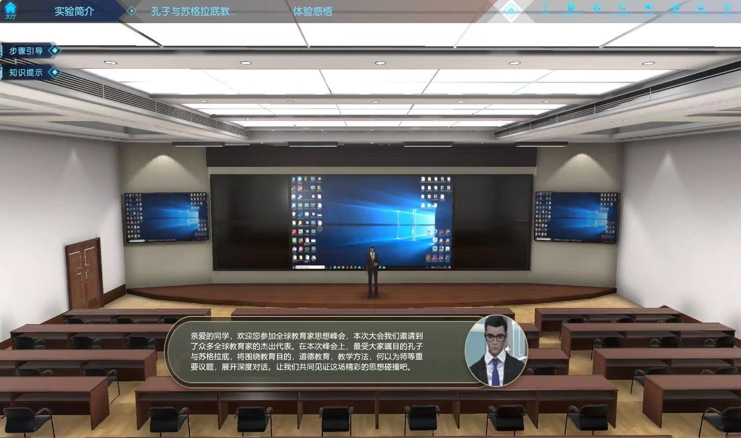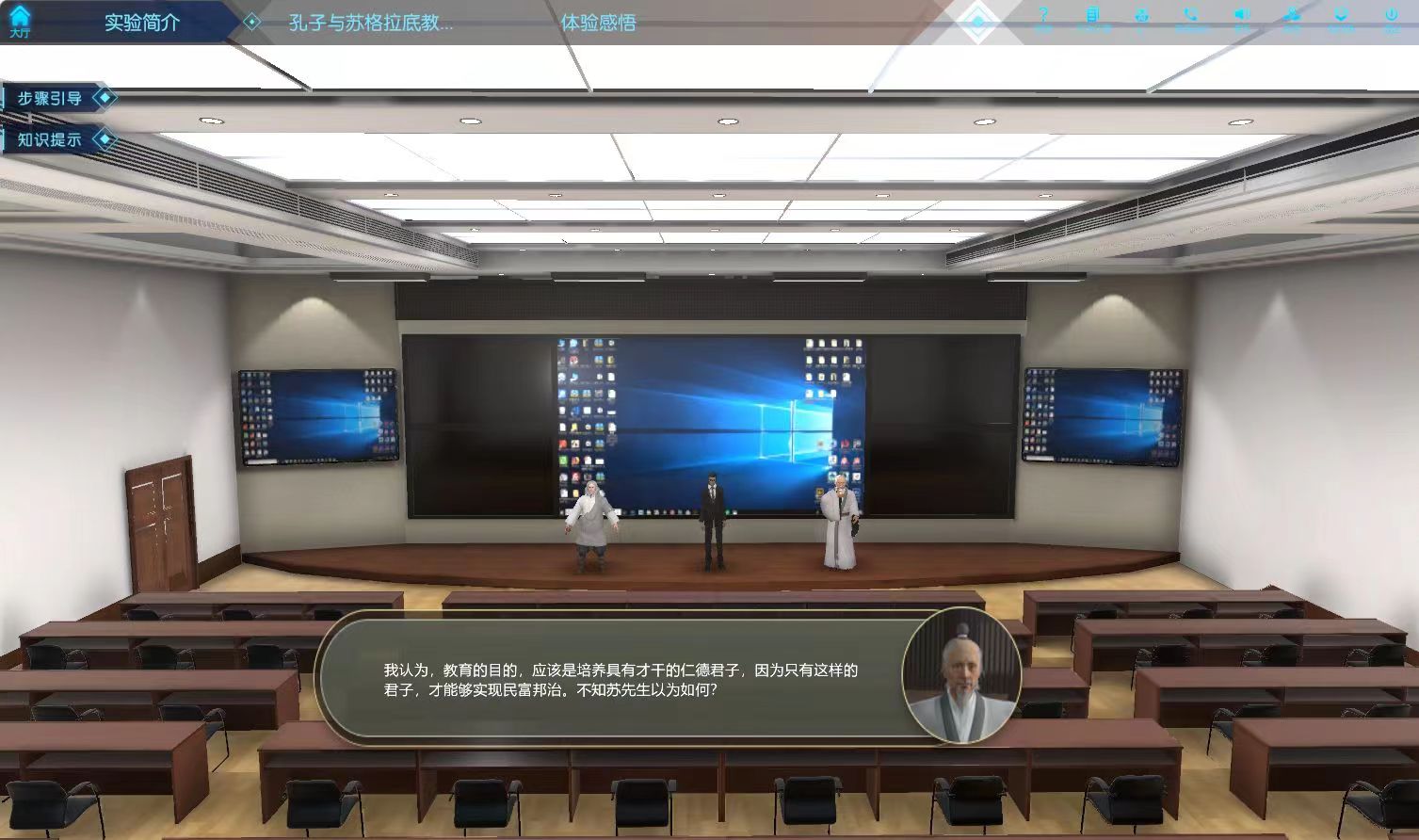 本实验项目是为了帮助学生深入理解孔子与苏格拉底的教育思想,以培养具有中国文化教育自信与西方文化教育理解的卓越教师目标,秉承“学生中心、问题导向、注重理解、发展思维”的实验教学理念,按照“虚实结合、以虚补实、以虚促实”的原则,以辨析中西方教育源头的异同为切入点,选取孔子(551—479BC)与苏格拉底(469—399BC)教育思想中最为核心的四个主题,采用3D建模、动画、语音识别、人机交互等技术,自主研发孔子与苏格拉底教育为思想的超时空对话虚拟仿真实验。