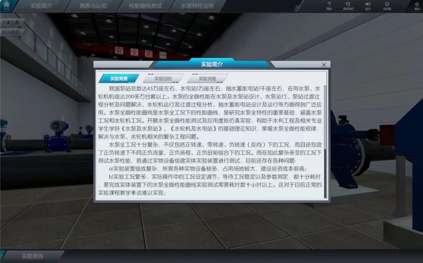 水泵全面性能测试虚拟仿真实验,目标是帮助学生掌握水泵全面性能的基本概念,包括相对流量、相对扬程、相对转矩、相对转速、相对功率、相对效率、相对性能曲线、水泵正常工况、水泵反常工况等,了解诸如水泵、电机、变频器、流量计、压力表、扭矩仪等实验设备及测试仪器的工作原理,学会水泵全面性能曲线实验测试方法,理解和掌握水泵全面性能曲线变化规律;学会运用水泵全面性能规律解决生产实际问题。