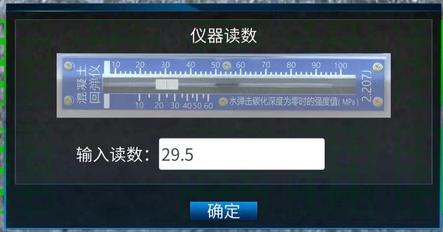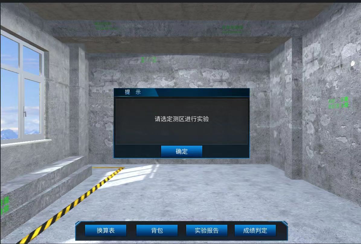 实验主要分为四个木块:混凝土测区测点选择、回弹值测定、碳化深度测定和混凝土强度测定。四个模块依次递进,让学生掌握混凝土无损检测的实验原理和方法。选择场景中测量的位置,根据提示从背包中寻找回弹仪完成所有测量,在背包中选择锤子、吹气气囊、酚酞试剂、深度尺下一步进行碳化深度测量。