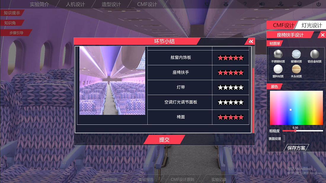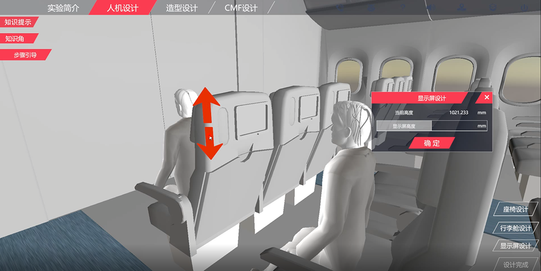 本实验根据工业设计专业培养方案和飞机客舱用户体验设计的技术特点,按照体系化设想,基于《人机工程学》、《产品形态设计》、《造型材料与工艺》三门专业核心课程的关键知识点,梳理出三个典型的民航大飞机客舱用户体验设计实验环节(如图1所示),以CR929大飞机客舱为虚拟仿真实验对象,开展以用户体验为特征的探究性虚拟仿真教学实验,达到以下实验目的:(1)通过飞机客舱人机设计实验环节,帮助学生在掌握人机工学基本原理的基础上,以飞机客舱为应用场景,综合运用人机工学设计方法开展人机环境、工作空间的人性化设计实践,以满足乘客在客舱内活动时的高效、安全和舒适性需求。从学生视角出发,体现了用户体验在“物理”、“生理”层面上满足人对设施尺寸的人机需求,反映人“物理层面”的人机尺寸及“生理层面”的操作感受。(2)通过飞机客舱内饰造型设计实验环节,巩固学生理解造型设计的基本原则与方法;促进学生掌握造型实体与空间的把控能力;促进学生协调造型与人机关系;促使学生掌握造型与工程实现的衔接关系;增强学生对于不同人群和情境体验设计的能力;提高学生的综合设计创新实践能力。从学生视角出发,体现了用户体验在“生理”、“心理”层面上满足人对设施形态的审美需求,反映人“生理层面”的形态尺度视觉感受,上升到“心理层面”的综合感受,从视觉感受内化到心理体验的过程。(3)通过飞机客舱内饰CMF(产品设计的颜色Color、材质Material与工艺Finishing基础认知)设计实验环节,巩固色彩构成课程中色相、纯度、明度、色彩对比与调和理论等的基本知识,能够主动运用常用造型材料表面处理工艺来达成不同的质感,提升综合设计应用能力。从学生视角出发,以视觉为先导,对飞机客舱内饰的色彩、表面质感及灯光照明效果等,从视觉感受的生理体验上升至知觉感受的心理体验,即乘客在乘坐飞机时,对乘坐空间产生情感共鸣,产生轻松、舒适、愉快、安全的综合心理感受。从学生视角出发,通过本项目以用户体验为特征的探究性实验,达到了总体的实验目的:1)树立“以人为中心”的设计理念;2)了解民航大飞机客舱用户体验设计的全流程;3)系统掌握人机、形态、色彩、质感的综合应用设计方法;4)培养面向复杂设计问题的高阶思维能力,培养为国之重器设计的远大志向和情怀。