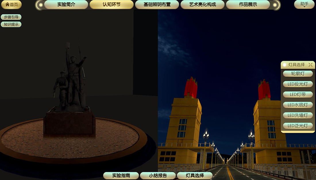 艺术亮化指的是艺术设计的夜景作品,是一种艺术再创造的高级亮化形式。是指利用艺术的视角,对建筑物、景观等进行特性和特质的分析,以一定的理念与设计手段相结合打造出来的城市夜景,从而使其难以凸显的艺术形态以一种艺术化的灯光装饰在特定环境中得以二次展现。本实验项目以长江大桥作为载体,以现代灯光技术为媒介,对大桥相关的建造故事、历史事件进行现代化的演绎与传承。开启大桥不同造型的灯光效果,点亮大桥不同时间的灯光效果。学生基于虚拟的长江大桥周围环境场景开展实验,面向实际艺术亮化设计的真实操作环境开展实际操作,全面提升对桥梁艺术亮化设计的宏观认知和实际操作,全面提升学生的实践操作技能和创新精神。