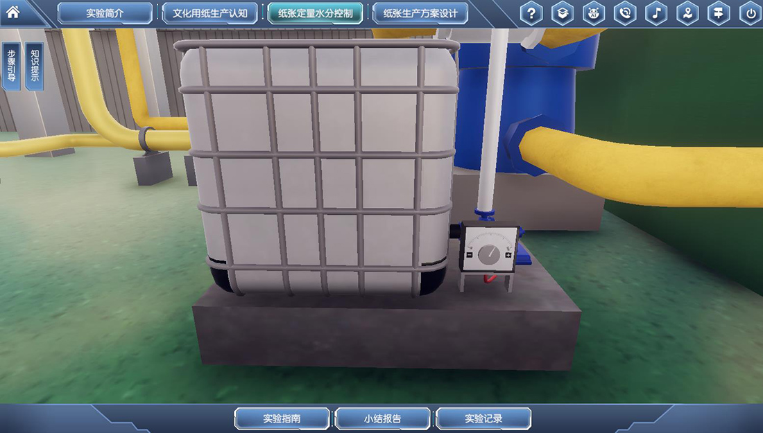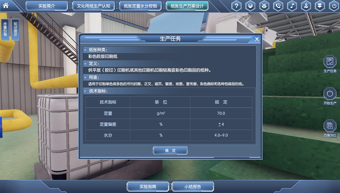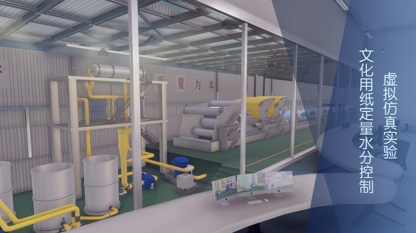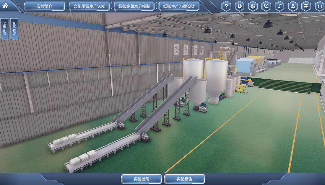 应用虚拟仿真的教学和实验手段来提高学生对于整个造纸系统的全面认识的理解,同时结合工厂的实际生产订单设计的实验内容和实验任务可以全面提升学生的对于整个造纸系统的认知能力。并应用相关的原理思考和分析影响纸张定量和水分的主要因素,设定主要的工艺参数,提出解决问题的最优化的工艺方案。现代化的造纸生产的特点现代化造纸工业的具有大型化,高速化,智能化和复杂性的特点。(1)大型化:现代化的大型造纸机宽度12 m,长度超过200 m。(2)高速化:造纸的生产过程涉及众多高速运转的造纸机械装备,现代化文化用纸生产的纸机运行车速已经达到1800米/分,实验者存在安全风险,导致生产实际全真体验不能在实验室实现。(3)智能化:目前造纸的生产都采用大型自动化DCS控制生产线,受限于场地和费用,导致大规模生产设备不能在实验室再现、大规格生产原料不能在实验室应用。(4)复杂性:造纸的生产包括原料碎浆和打浆系统、配浆系统、供浆系统、流送系统、网部成形及真空脱水系统、压榨脱水系统、烘缸部干燥系统、水分定量控制系统、压光和卷取系统等;造纸工艺复杂、设备繁多、造纸工艺参数相互关联度高,在实验教学中难以全方位多角度地展示真实完整的造纸过程以及参数设置对生产过程与产品质量的影响。