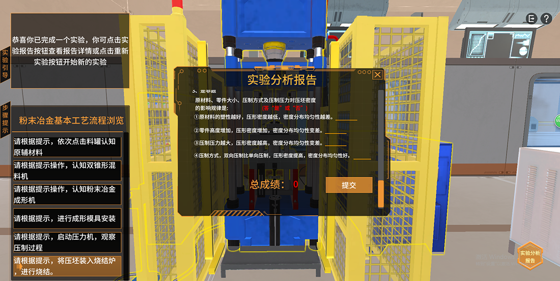 针对粉末冶金成形技术学习难点问题,设计二个模块的教学内容,第一模块通过虚拟现实场景漫游,学生了解粉末冶金设备功能、产品制造工艺流程。通过参数化虚拟实验,了解产品质量的影响因素及规律,为改进工艺加深理论基础。第二模块是粉末冶金制造安全防护设计内容。项目组成员与德国皮尔滋公司合作对真实的实验教学系统进行安全防护设计及改造。与此同时,将先进的安全防护技术设备以虚拟现实的手段开发出虚拟仿真实验。通过校企合作发展了金工实习课程,学生从机械安全技术标准层面提升制造过程安全意识,提高安全设计能力。