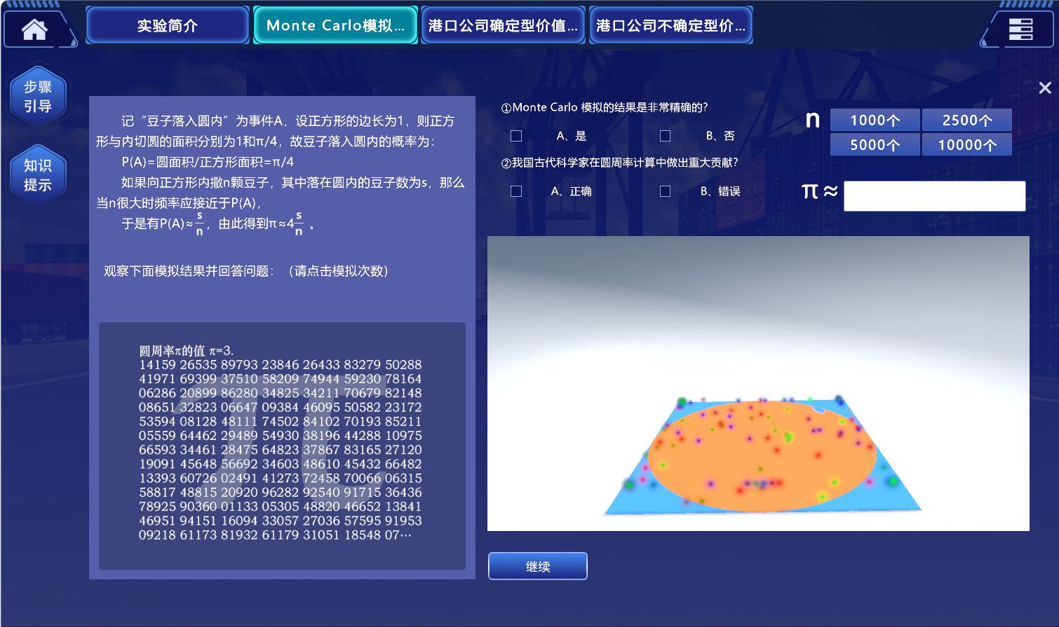 1.Monte Carlo模拟基础:该环节包括两个独立的虚拟仿真实验,①计算圆周率π模拟仿真实验,通过实验了解Monte Carlo方法产生的历史与计算原理;②大学生创业模拟仿真实验,通过引入Monte Carlo模拟,突破传统财务管理的经营环境确定的假设限制,使学生建立起风险意识,为进一步研究不确定型价值评估打下良好基础。