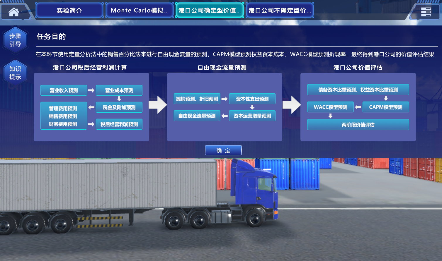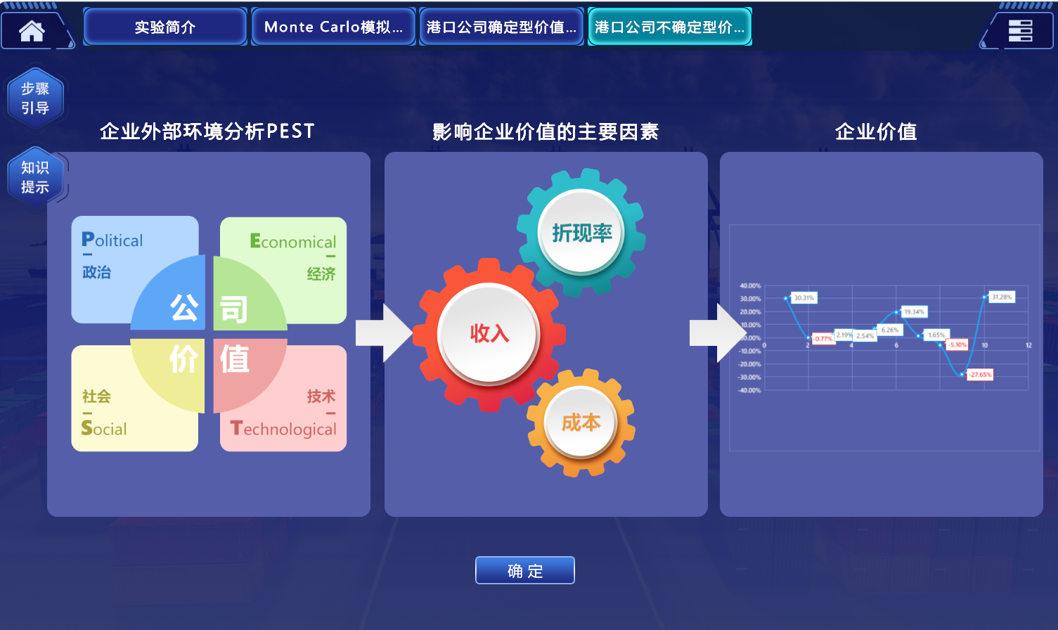 2.突出价值评估中的“虚拟仿真”场景。通常港口企业远离高等学校,同时物流交通运输场地具有严格的安全要求,并且企业价值评估是应用历史数据对未来进行预估,这样只有应用“虚拟仿真”才能实现。该软件通过虚拟情景沉浸式体验,全面展现财务管理中的资金运动流程,有利于学生掌握财务管理中的“收入-利润-现金流量”等关键指标预测方法;进而通过战略环境PEST分析进行多因素敏感性分析以及Monte Carlo模拟,真实反映外部环境变化对企业价值的影响。