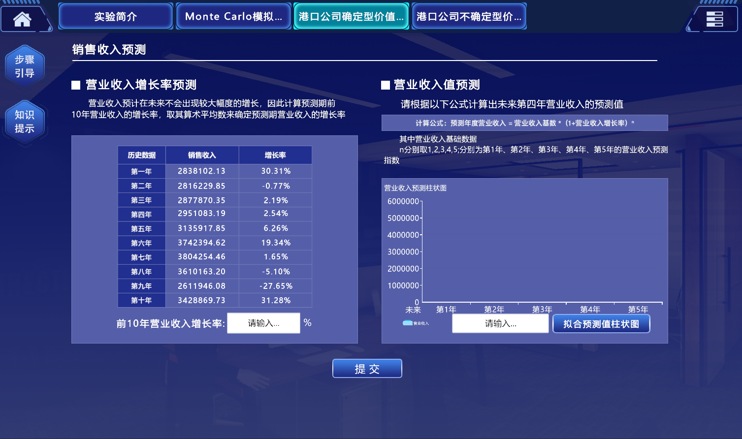 《基于Monte Carlo模拟的沿海港口上市公司价值评估》虚拟仿真实验项目,是以某沿海港口历史财务数据为基础,通过销售百分比分析方法,预测未来港口公司的自由现金流量,应用二阶段价值评估模型计算港口公司未来的价值创造。