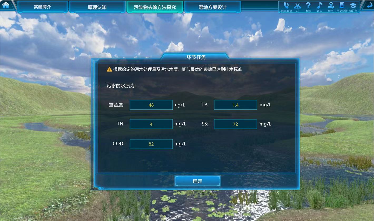 本实验项目以某真实湿地为原型进行虚拟仿真,对仿真模型进行深入剖析,通过半剖、半透视等技术手段,直观展示人工湿地的具体构造,处理原理、流程组成等方面,全面认识学习人工湿地。通过对人工湿地生态修复技术设计虚拟仿真实验,学生基本掌握不同类型人工湿地的基本特点、植物、微生物以及基质对不同污染物的去除机理、不同进水水质条件下人工湿地的模式和设计方法。